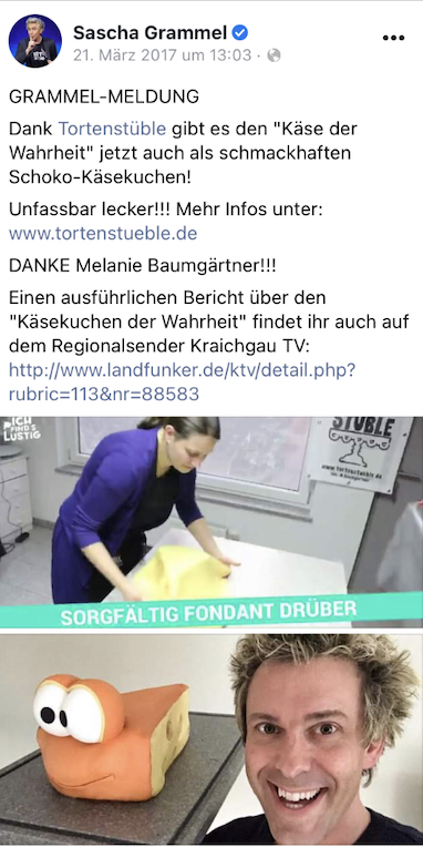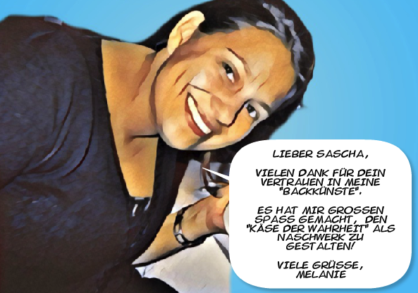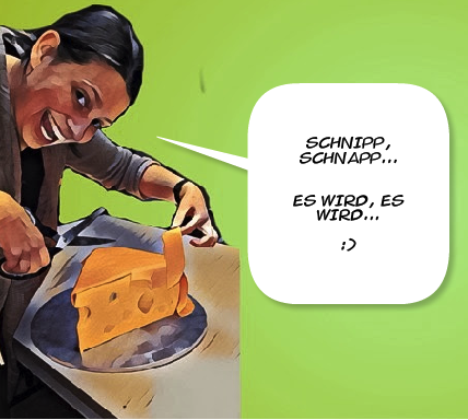 Neulich im Tortenstüble... Melanie ist ganz entspannt... ...dieses Video. ...größeres Bild. Und los geht's! Der Käse nimmt Gestalt an. Geschafft!